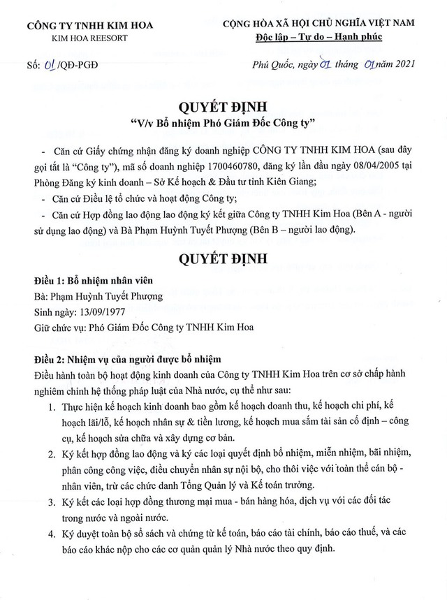 Trước đó, ngày 1-1-2021, chính ông Thanh với vai trò Chủ tịch HĐTV đã ký quyết định bổ nhiệm bà Phượng giữ chức Phó Giám đốc khách sạn Kim Hoa; giao quyền điều hành toàn bộ hoạt động kinh doanh của khách sạn cho bà Phượng