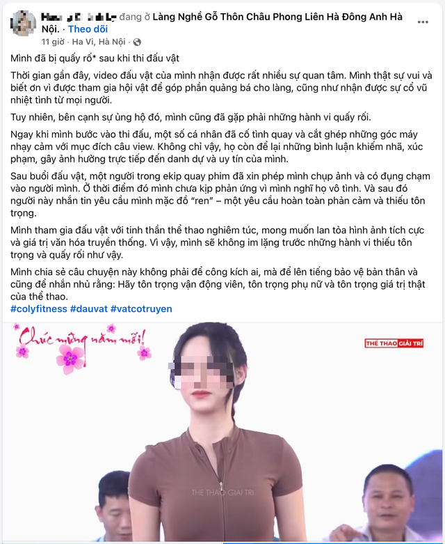 Những ngày gần đây, đoạn video ghi lại phần tranh tài của H.K.L tại giải vật ở làng Quậy, xã Châu Phong, huyện Đông Anh (Hà Nội), diễn ra ngày 2/3/2026, được lan truyền rộng rãi. Bên cạnh sự cổ vũ dành cho tinh thần thi đấu của cô, nữ vận động viên cho biết bản thân cũng phải đối diện với những tình huống khiến cô cảm thấy bị tổn thương.