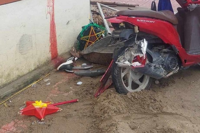 Tại hiện trường, chiếc xe máy bị vỡ nát phần đuôi. Nhiều mảnh vỡ văng ở bờ tường phòng bảo vệ và sân trường.