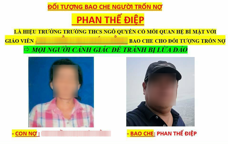 Những ngày sau đó, ông Điệp và người thân tiếp tục bị gọi điện “khủng bố”, đề nghị tác động để cô H. trả nợ. Đến chiều 24/3, Hiệu trưởng Trường THCS Ngô Quyền phát hiện còn phát hiện trên mạng xã hội Facebook đăng hình ảnh của ông ghép cùng cô H. với nội dung: “Đối tượng bao che người trốn nợ P.T.Đ là Hiệu trưởng Trường THCS Ngô Quyền có mối quan hệ bí mật với giáo viên M.T.T.T.H…”.