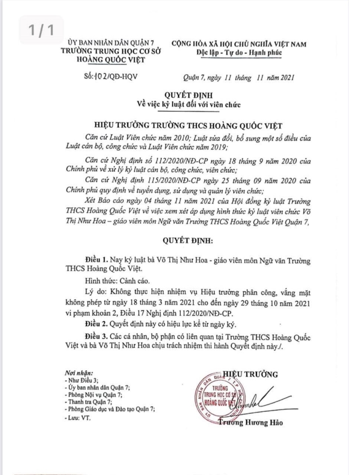 Trong buổi chiều ngày 2/12, lãnh đạo Trường THCS Hoàng Quốc Việt tổ chức buổi họp kiểm điểm viên chức đối với cô Hoa với hành vi vi phạm theo thông báo số 322/TB-HQV ngày 24/11/2021, yêu cầu cô Hoa có bản kiểm điểm và tự nhận hình thức kỷ luật theo quy định. Tuy nhiên, cô Hoa cho biết bản thân không hề nhận được thư mời họp từ phía nhà trường.