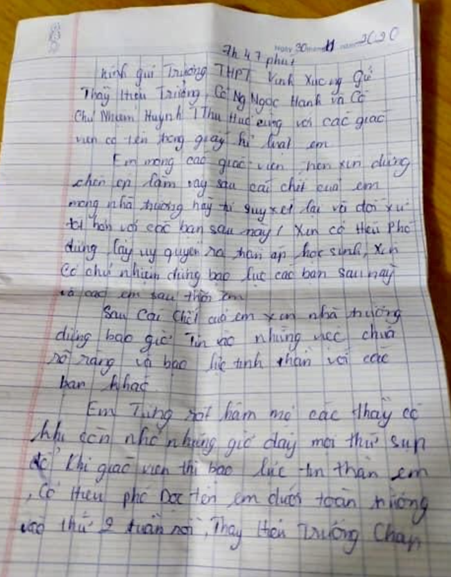 Đến sáng 30/11, Y. uống 10 viên sabutamol (trị hen phế quản) và ngất trong nhà vệ sinh của trường, để lại 2 lá thư tuyệt mệnh kể rõ việc uất ức của mình.