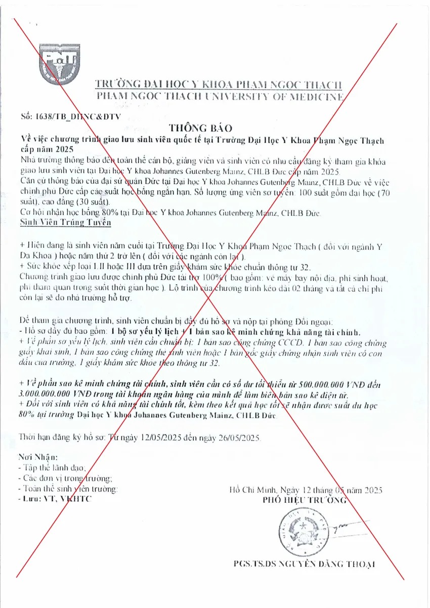 Đại diện Trường ĐH Y khoa Phạm Ngọc Thạch xác nhận, sinh viên MT bị lừa bởi một văn bản giả mạo về chương trình giao lưu sinh viên quốc tế tại trường năm 2025.