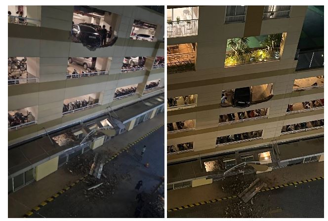 Hậu quả, một phần bức tường của bãi đỗ xe ở tầng 4 chung cư Tropic bị đổ sập, rơi xuống bên dưới khuôn viên chung cư