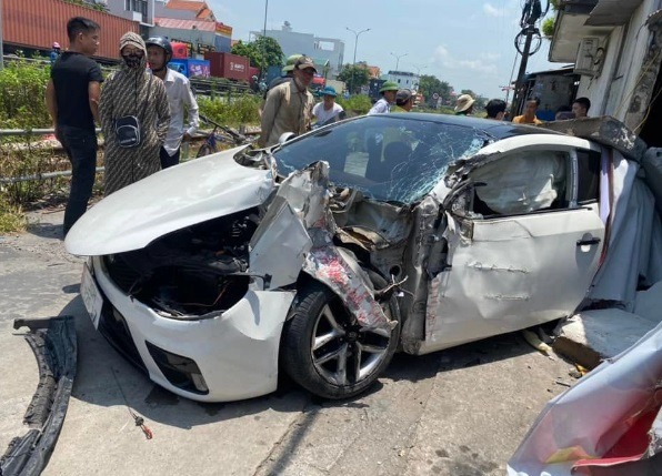 Cú va chạm mạnh khiến chiếc ô tô con bị văng ra rồi tiếp tục đâm vào tường nhà dân sau đó xoay 180 độ.