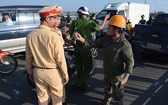 Vụ việc kéo dài gây ách tắc giao thông trên cầu mặc dù lực lượng Công an TP Quảng Ngãi được huy động hỗ trợ, thuyết phục nhóm người cản trở trên. Không dừng lại, bà Nguyễn Thị Hà còn tấn công, cắn vào tay một cán bộ CSGT Công an TP Quảng Ngãi khiến đồng chí này bị thương nhẹ.