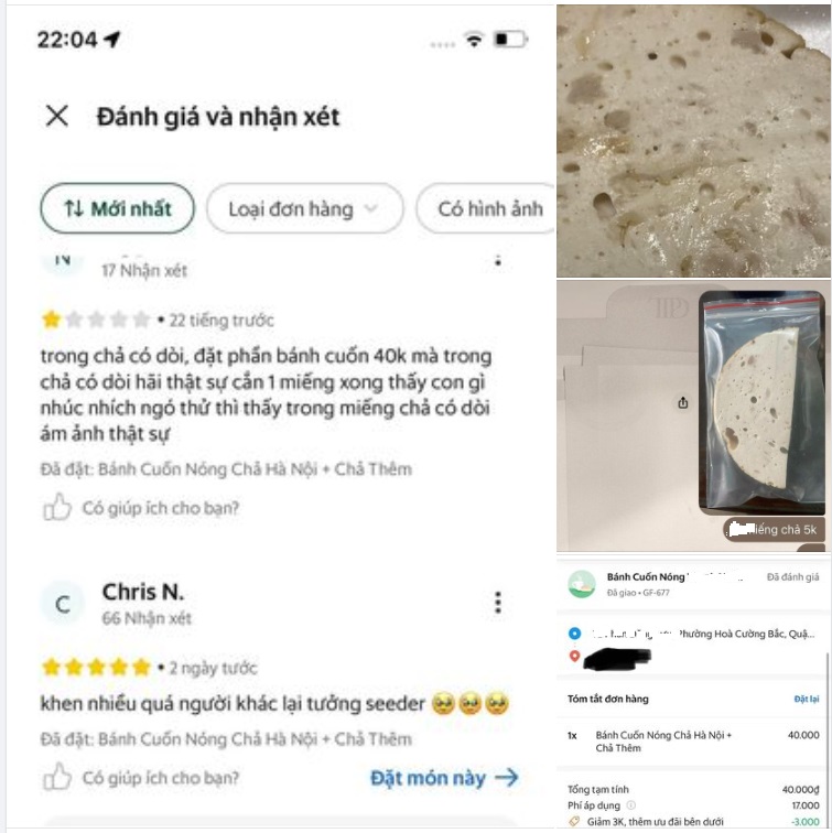 “Đặt phần bánh cuốn 40 nghìn đồng mà trong miếng chả lại có dòi, hãi thật sự. Cắn một miếng xong thấy con gì nhúc nhích, ngó thử thì thấy trong miếng chả có dòi, ám ảnh thật sự”, nữ thực khách N. đã để lại lời đánh giá về quán bánh cuốn nóng trên đường Phan Đăng Lưu (quận Hải Châu, Đà Nẵng) trên ứng dụng giao đồ ăn.
