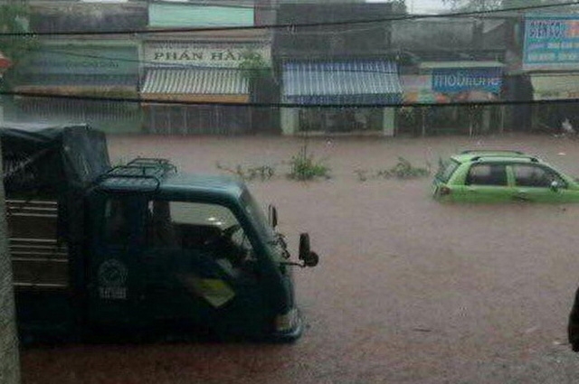 Khi đi đến đoạn đường ĐT759 thuộc phường Long Phước, xe chết máy do trời mưa rất to, nước dâng cao và chảy xiết.