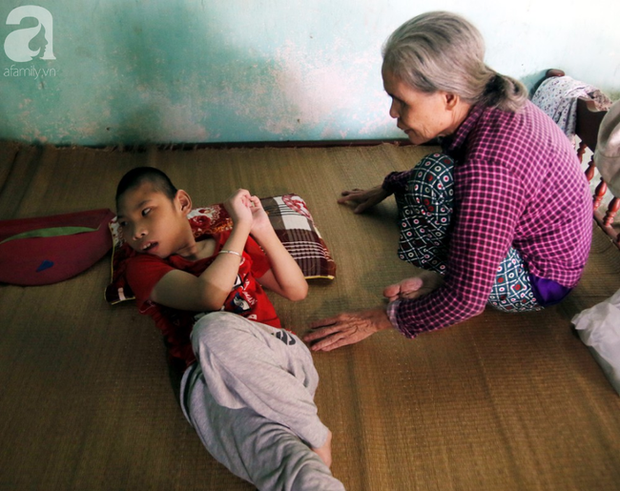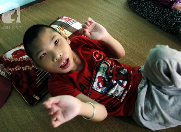 Bé Nguyễn Thiện Tâm nay đã gần 10 tuổi nhưng như một đứa trẻ lên 3 khi không thể đứng, ngồi, ăn uống, sinh hoạt như những đứa trẻ bình thường. Cả ngày, Tâm chỉ nằm một chỗ co duỗi chân tay và thỉnh thoảng gào khóc thảm thiết.