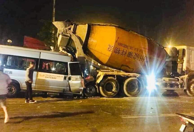 Tại thời điểm trên, một chiếc xe ô tô 16 chỗ chỗ mang BKS 29B-177.95, trên thành xe có dòng chữ trường Quốc tế Gateway đã tông vào sau xe bồn bê tông mang BKS 29C-887.98 đang dừng chờ đèn đỏ.