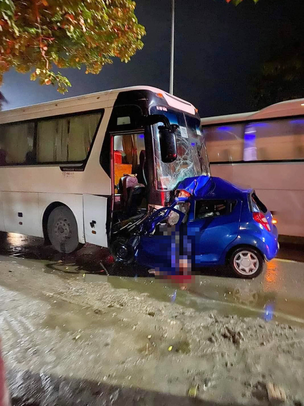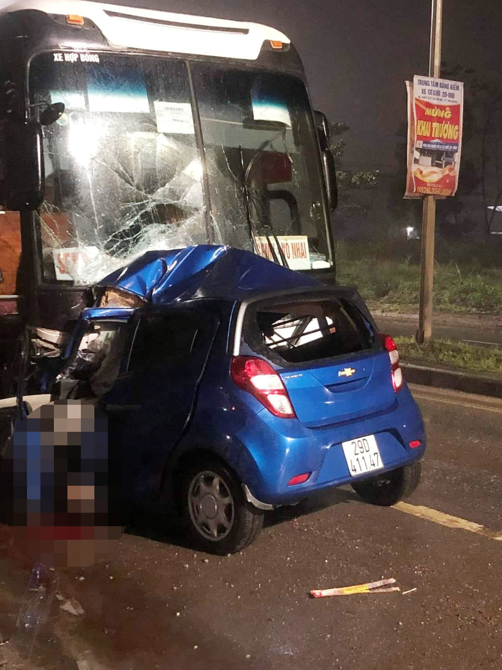 Qua bức ảnh hiện trường, có thể thấy xe khách và xe con tông trực diện, phần đầu của 2 xe dính chặt vào nhau. Phần thân của xe con 4 chỗ gần như bị "nuốt chửng", nát vụn dưới mui xe.