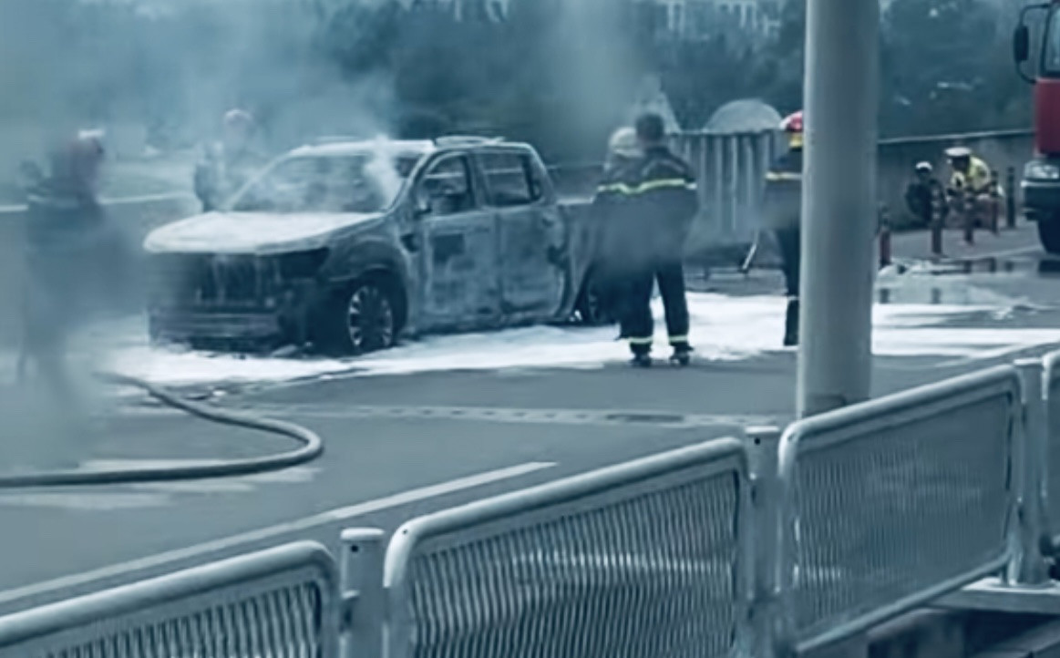 Ngọn lửa nhanh chóng lan rộng, bao trùm ô tô bán tải, khói bốc lên nghi ngút.