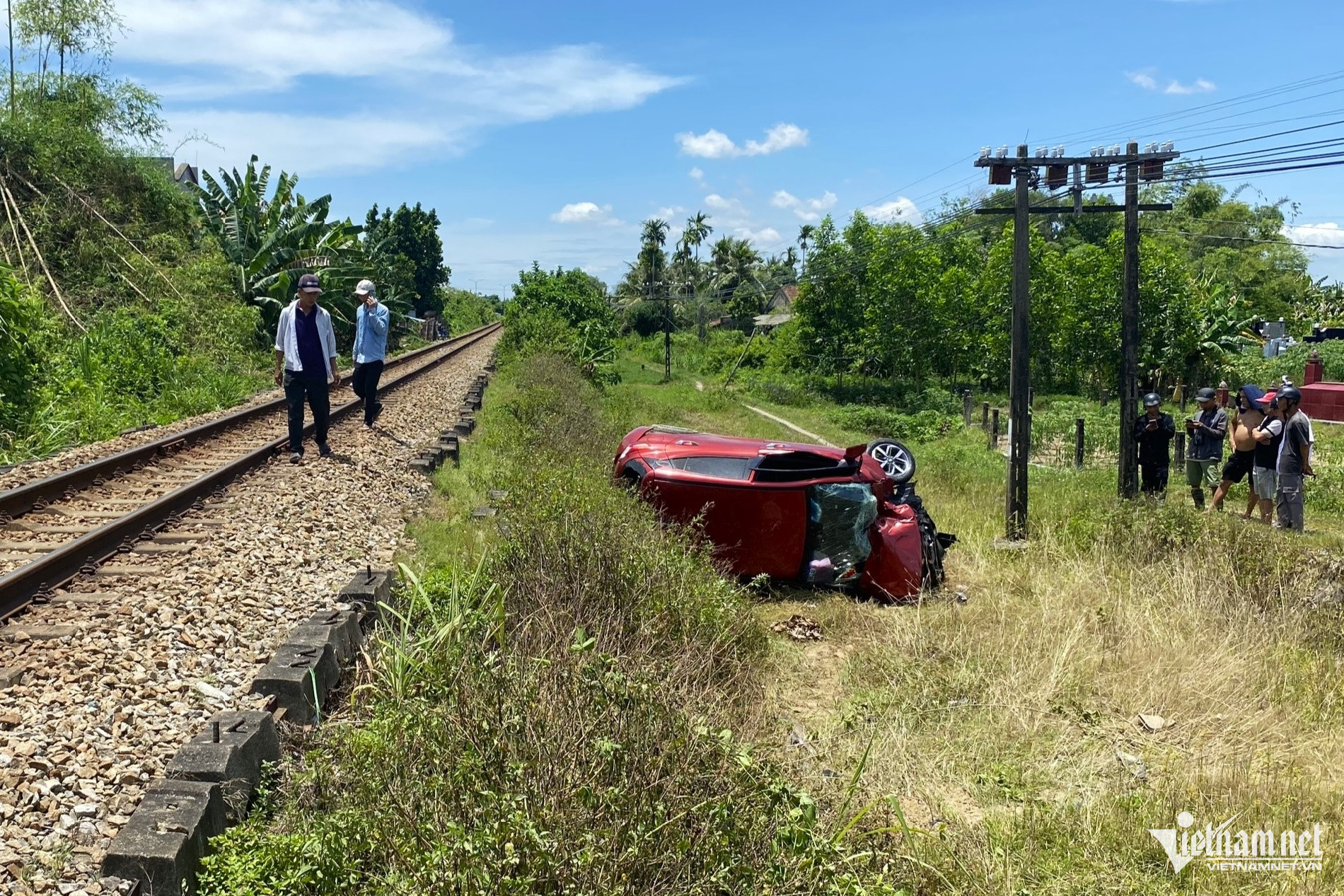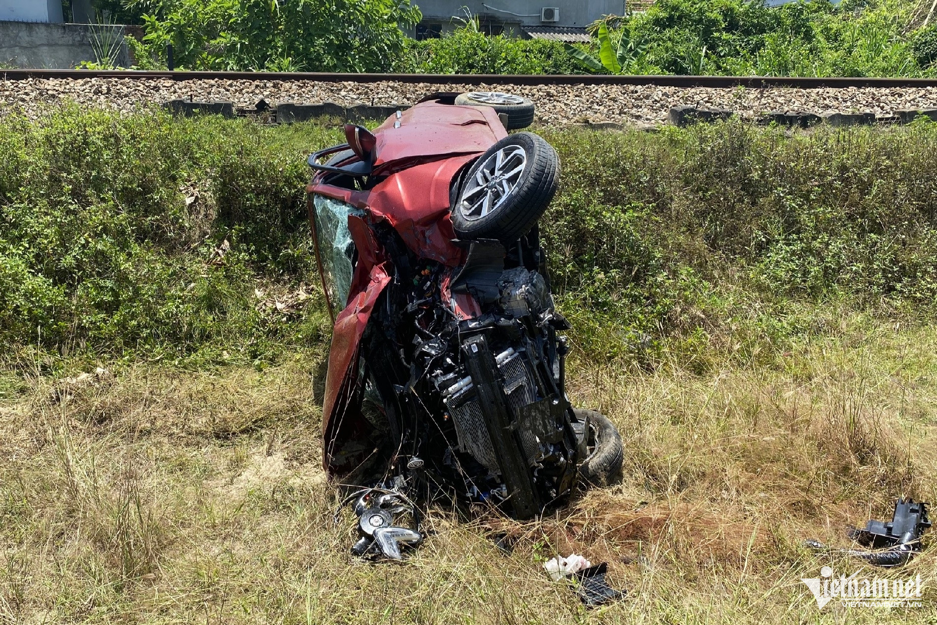 Khi băng qua đường sắt, đoạn giao nhau với đường bê tông dân sinh (thôn Bà Bầu), ô tô bị tàu SE5 chạy hướng Hà Nội - TPHCM húc văng gần 10m.