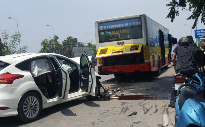 Khi đến đoạn qua xã Song Phương (huyện Hoài Đức, Hà Nội), xe này đâm thẳng vào đuôi xe buýt biển kiểm soát 29LD-007.91 đang dừng đón trả khách bên đường.