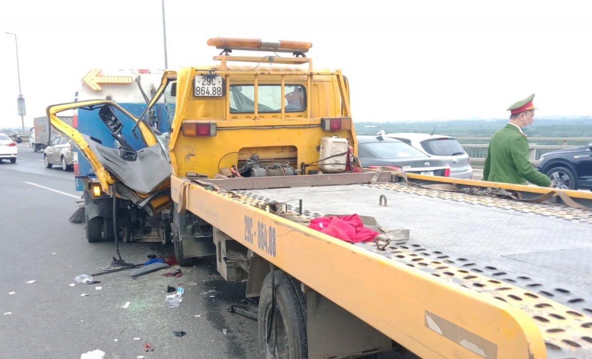 Vào khoảng 15h cùng ngày, xe quét, hút rác mang BKS: 29C-224.44 đang thực hiện nhiệm vụ duy trì vệ sinh môi trường trên cầu Nhật Tân (hướng đi Nội Bài) bất ngờ bị xe cứu hộ mang BKS: 29C-864.88 đâm rất mạnh vào đuôi.