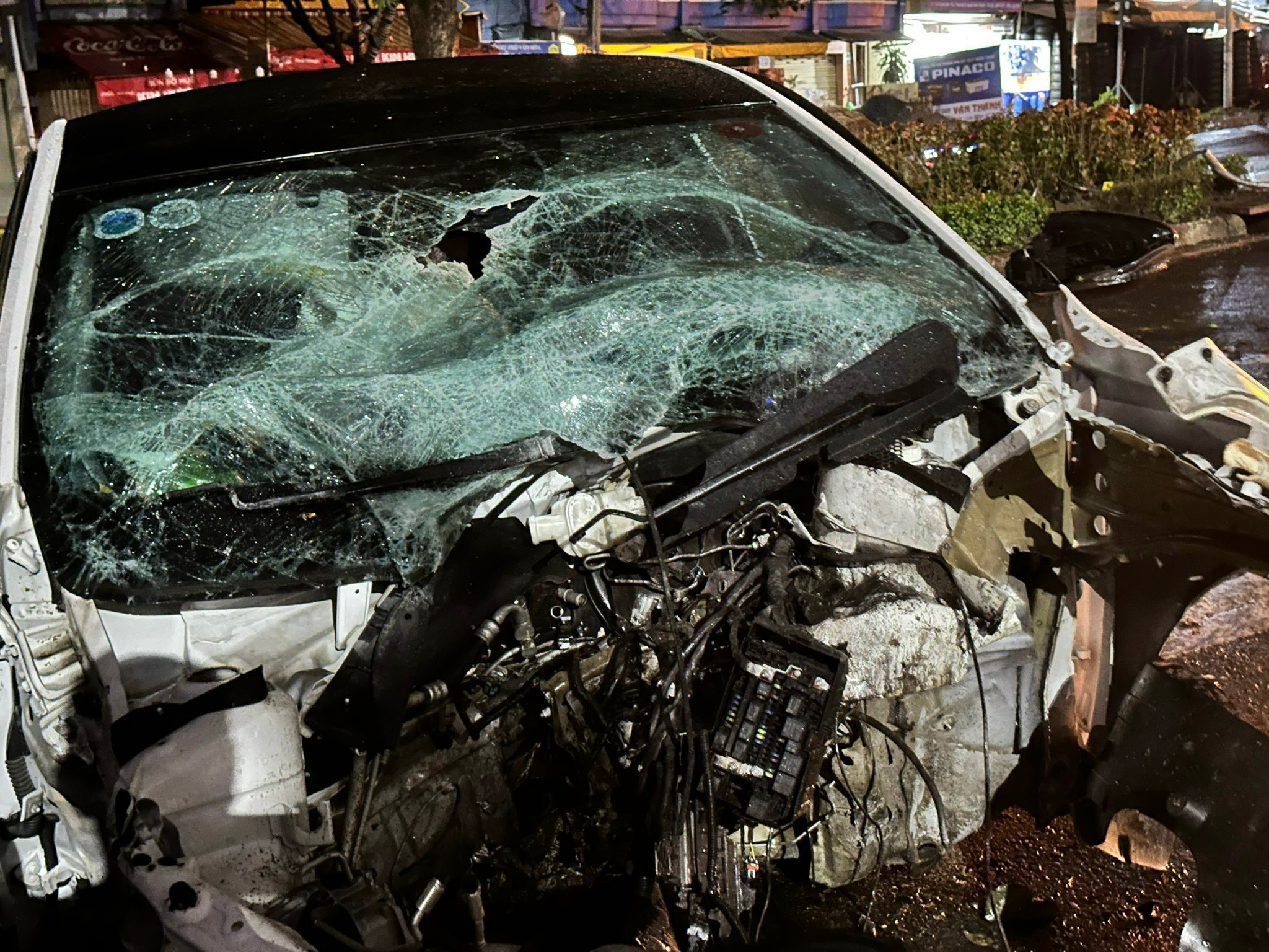 Tại hiện trường, ô tô bị hư hỏng nặng, mảnh vỡ vụn văng khắp mặt đường. Một cột điện cùng cây xanh bị ô tô tông gãy, nằm ngổn ngang giữa đường.