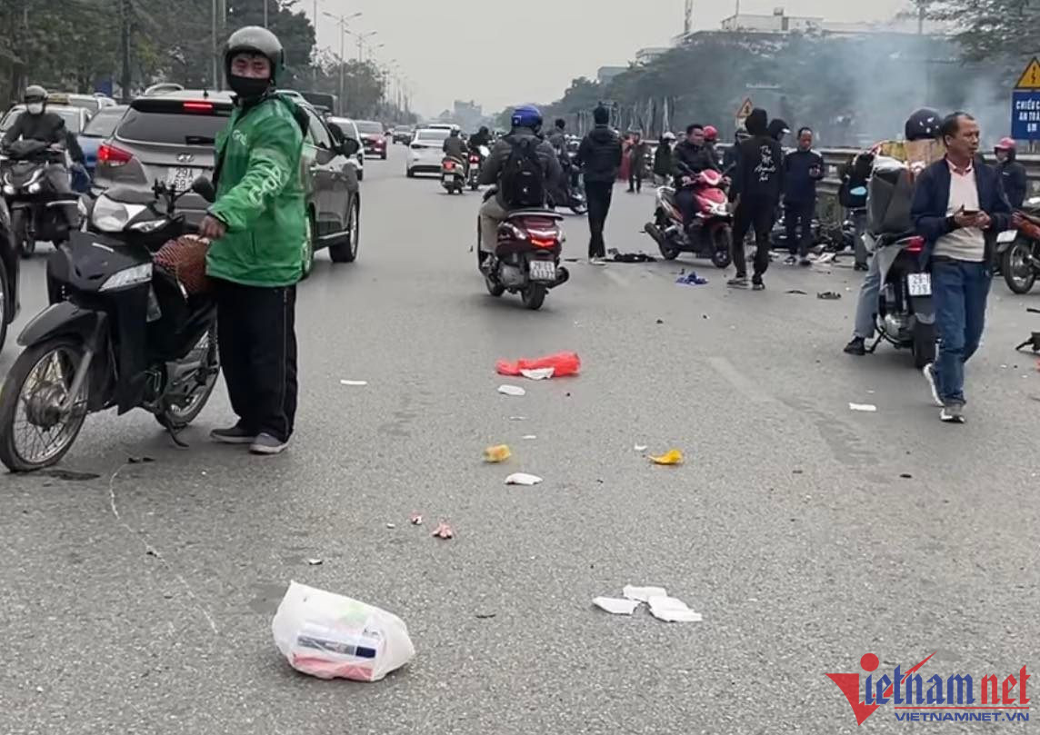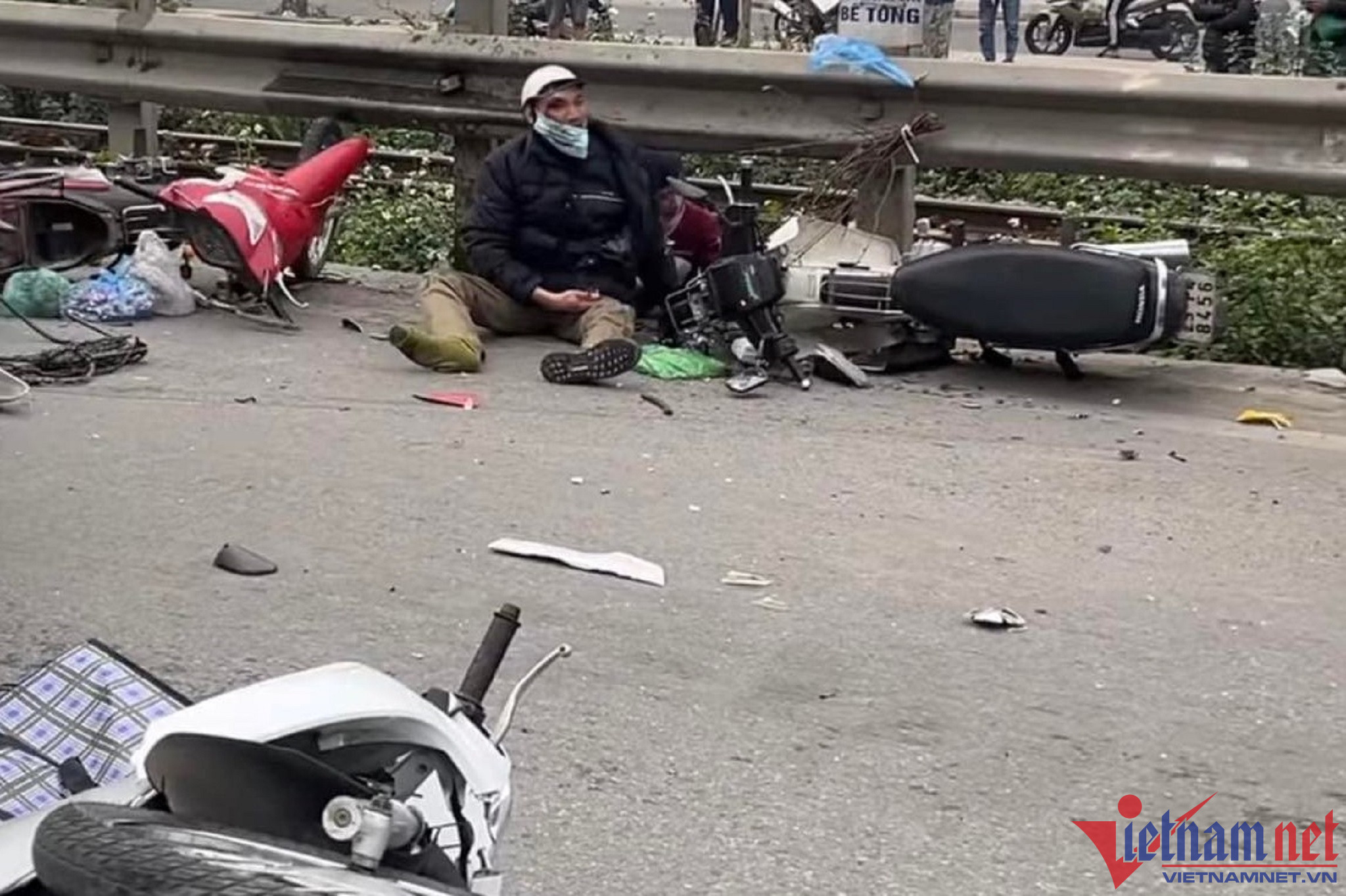 Tại hiện trường, có ít nhất 4 người nằm bất tỉnh trên đường. Phần đầu của ô tô con và 7 xe máy bị hư hỏng.
