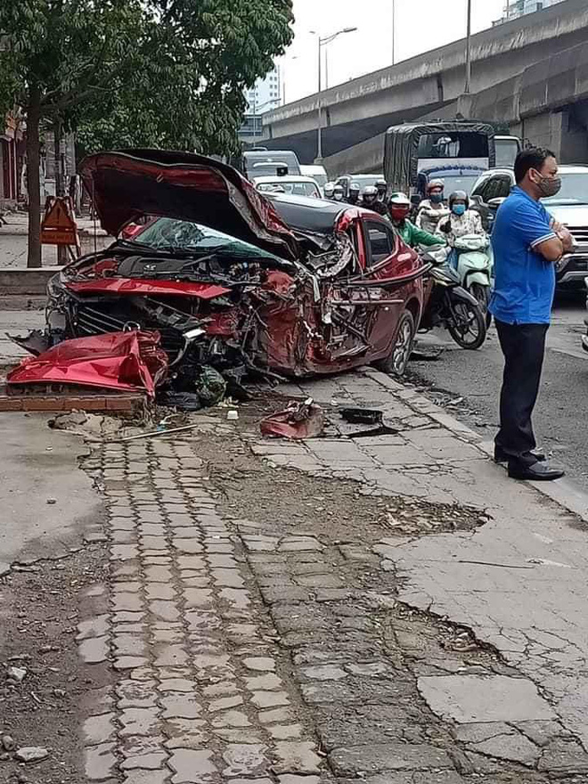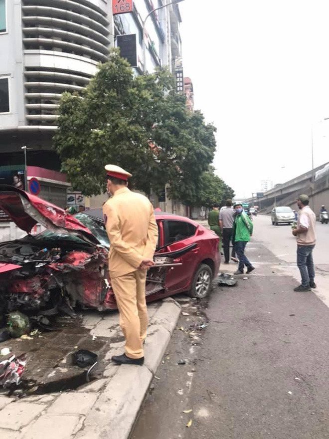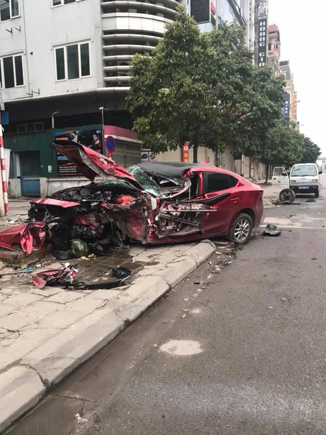Tại hiện trường, chiếc xe bồn đã được kéo đi, chỉ còn lại chiếc Mazda3 nằm trên vỉa hè với nhiều mảnh vỡ. Phần đầu xe hư hỏng nặng, thậm chí phần kính gió và nóc xe cũng bị biến dạng, vỡ vụn.