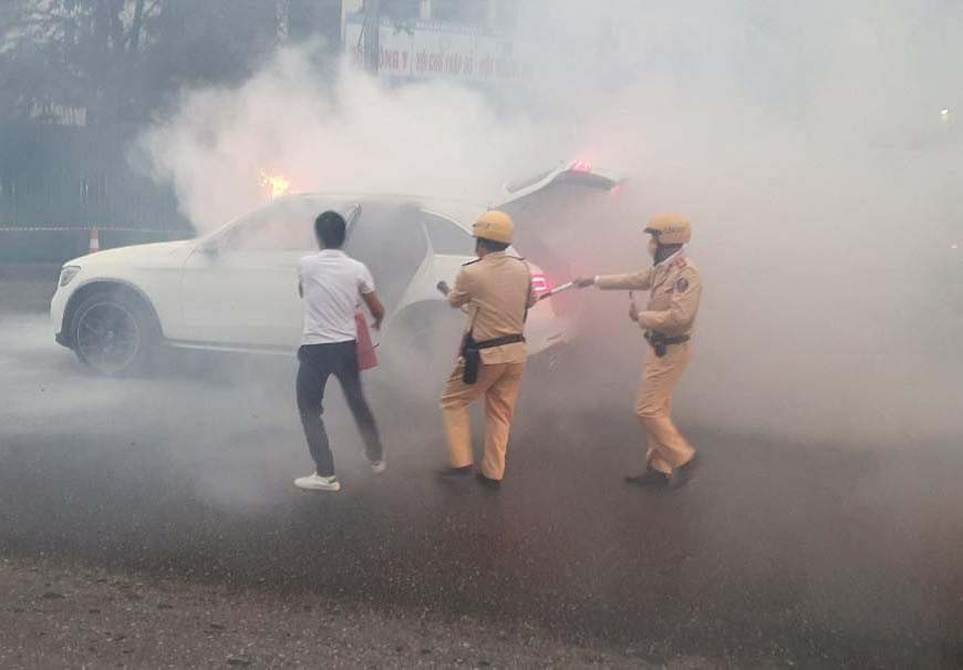 Khi thấy vụ hỏa hoạn, tổ tuần tra Đội CSGT số 6, Phòng CSGT (Công an TP.Hà Nội) đang tuần tra trên đường Phạm Hùng đã hô hoán ra hiệu lệnh dừng xe, thông báo cho những người đi trên ô tô biết. Sau đó, tổ công tác nhanh chóng mở cửa đưa những người trên xe xuống khu vực an toàn trước khi ô tô bốc cháy phần đầu.