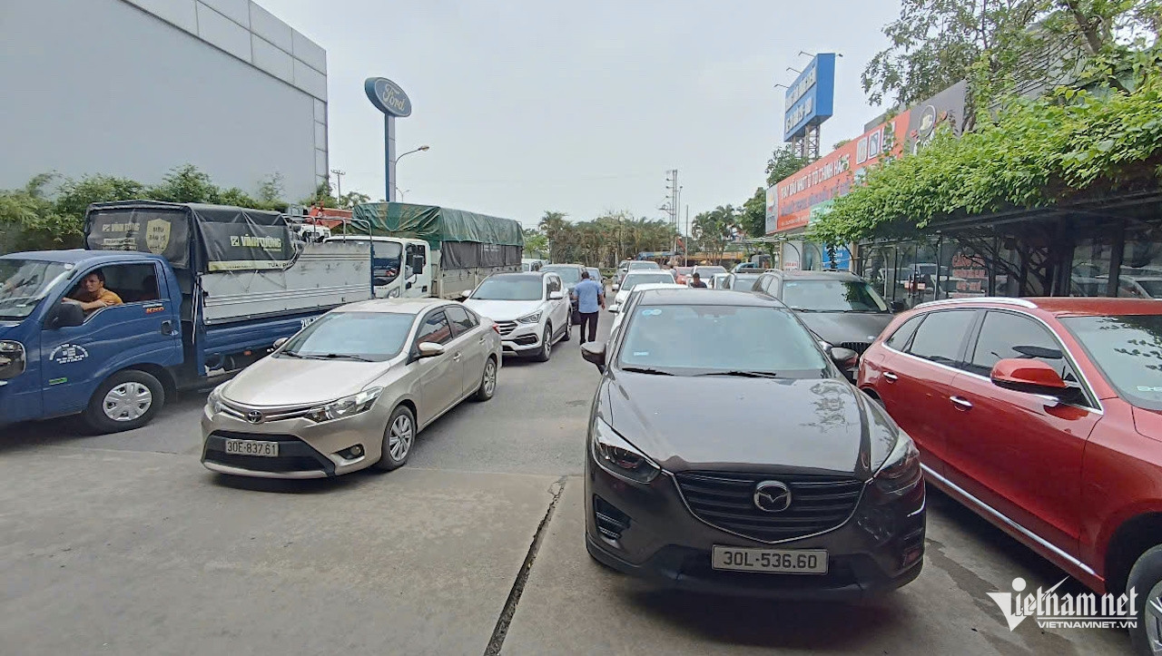 Trong các ngày 5-6/5, xe xếp hàng kín sân trung tâm, kéo dài đến chân cầu vượt đối diện Trường Đại học Giao thông Vận tải.