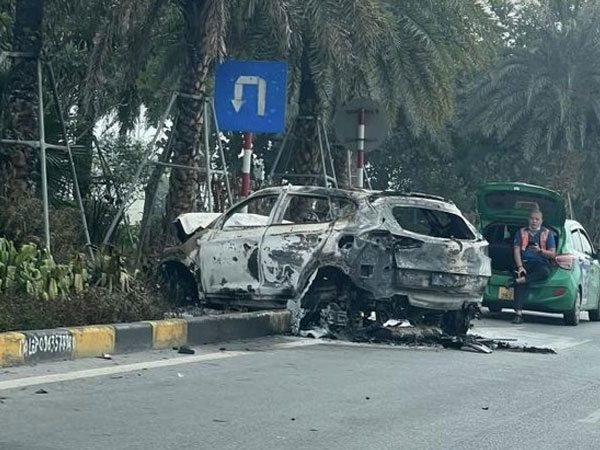 Đang di chuyển trên đường Võ Nguyên Giáp gần sân bay Nội Bài thì xe ô tô bất ngờ tông vào dải phân cách rồi bốc cháy ngùn ngụt. Rất may không có thương vong về người.