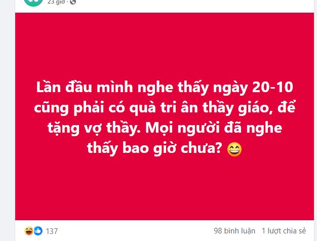 Mới đây, trên một hội nhóm phụ huynh có hơn 300 nghìn thành viên, một phụ huynh bức xúc chia sẻ: "Lần đầu mình nghe thấy ngày 20/10 cũng phải có quà tri ân thầy giáo, để tặng vợ thầy. Mọi người đã nghe thấy bao giờ chưa?".
