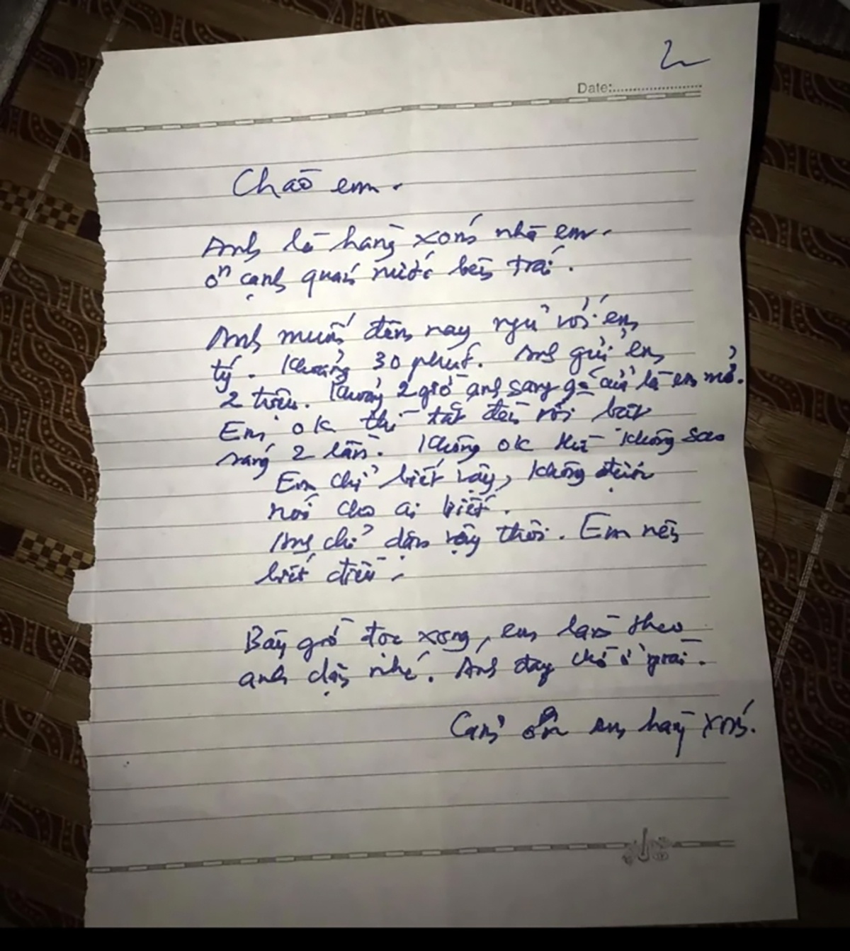 Bức thư được cô gái đăng tải kèm bài viết. Trong thư, người đàn ông bày tỏ mong muốn được "ngủ cùng em đêm nay". Người đàn ông cũng "dặn dò" cô gái: "Ok thì tắt đèn rồi bật sáng 2 lần, không ok thì không sao. Em chỉ biết vậy, không nên nói cho ai biết, anh chỉ dặn vậy thôi, em nên biết điều”.