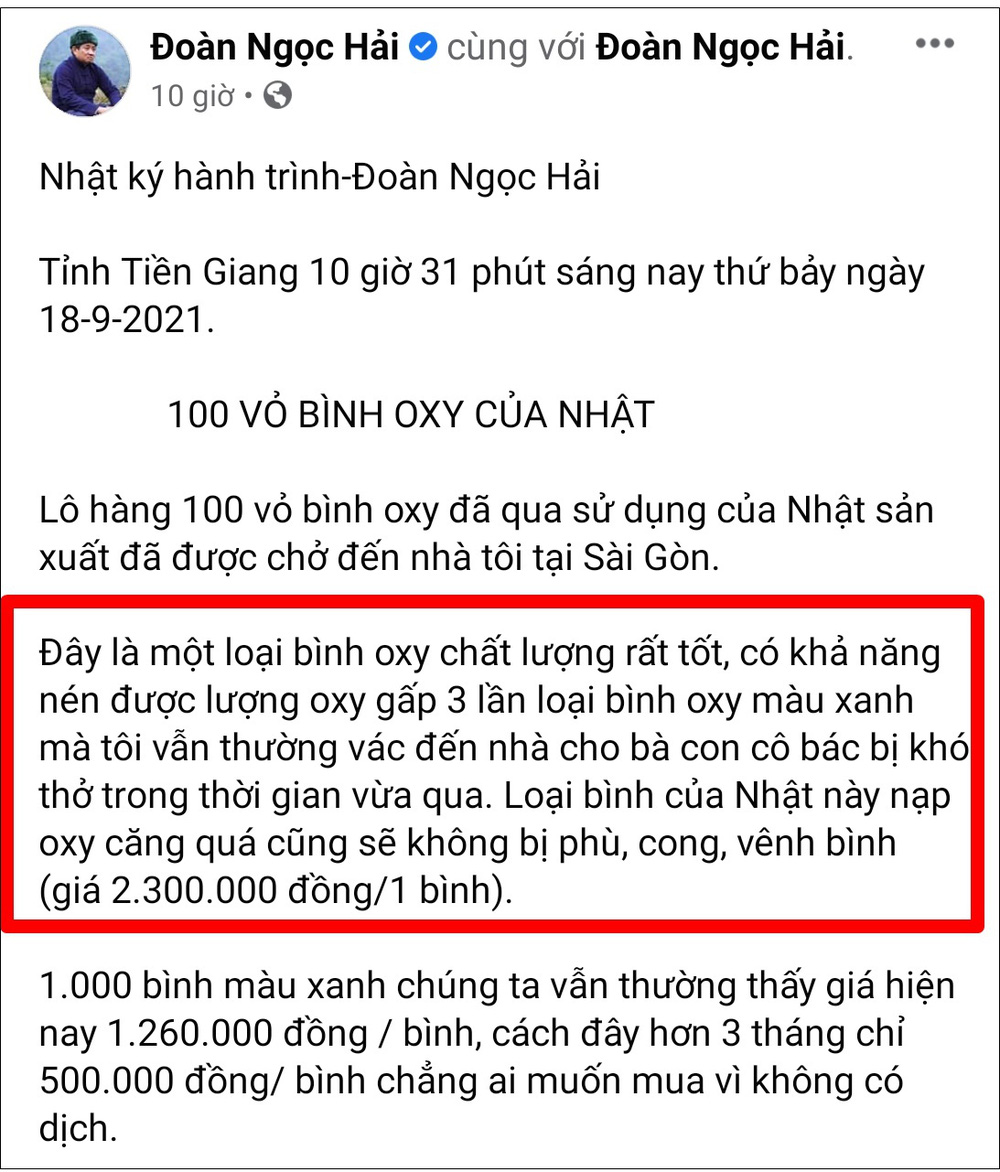 Chẳng là, ông vui mừng kể chuyện mình mới nhập về lô hàng 100 vỏ bình oxy đã qua sử dụng của Nhật sản xuất. Ông khoe: "Đây là một loại bình oxy chất lượng rất tốt, có khả năng nén được lượng oxy gấp 3 lần loại bình oxy màu xanh mà tôi vẫn thường vác đến nhà cho bà con cô bác bị khó thở trong thời gian vừa qua. Loại bình của Nhật này nạp oxy căng quá cũng sẽ không bị phù, cong, vênh bình. Đồ của Nhật và người Nhật thì chuẩn mực miễn bàn".