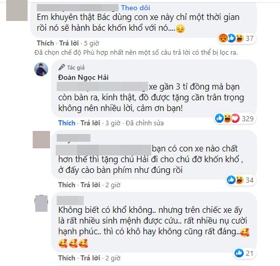 Thật bất ngờ là bên cạnh những lời chúc mừng ông Hải có xe mới, hành trình mới đỡ vất vả hơn, lại có người nói ngay một câu xúi quẩy: "Em khuyên thật, bác dùng con xe này chỉ một thời gian rồi nó sẽ hành bác khốn khổ với nó". Không biết ý sâu xa của người này là gì, muốn cảnh báo về độ xịn của xe, lo lắng cho sức khỏe của ông Đoàn Ngọc Hải hay đá xoáy nghệ sĩ Việt Hương. Nhưng những lời viết ra đã khiến ông Hải và một số người theo dõi nổi giận, cho rằng người này đã xúc phạm, trù ẻo ông Hải.