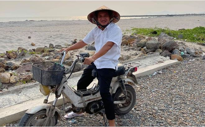 Kèm theo chia sẻ là hình ảnh ông Hải đội nón lá, mang dép tổ ong, đi xe Chaly bên bờ biển.
