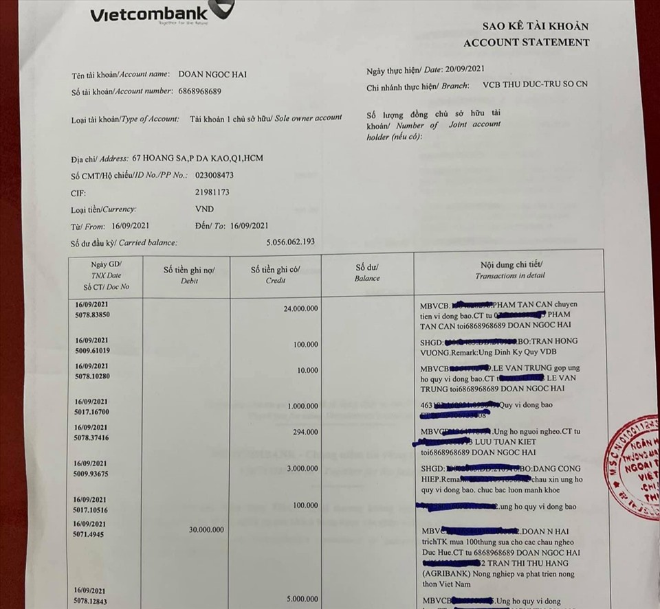 Trước đó, ông Đoàn Ngọc Hải cũng đã công khai minh bạch tiền sao kê từ thiện trong suốt thời gian qua đồng thời, khẳng định không làm điều gì khuất tất với bà con. Để chứng minh điều này, ông Hải đã sao kê hơn 5 kg giấy và để tại Ngân hàng Vietcombank chi nhánh Thủ Đức để bất kỳ ai cũng có thể đến xem và giám sát hoạt động các khoản thu, chi và tồn quỹ của "Quỹ vì đồng bào".