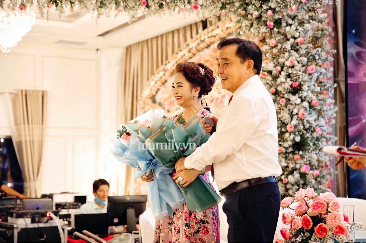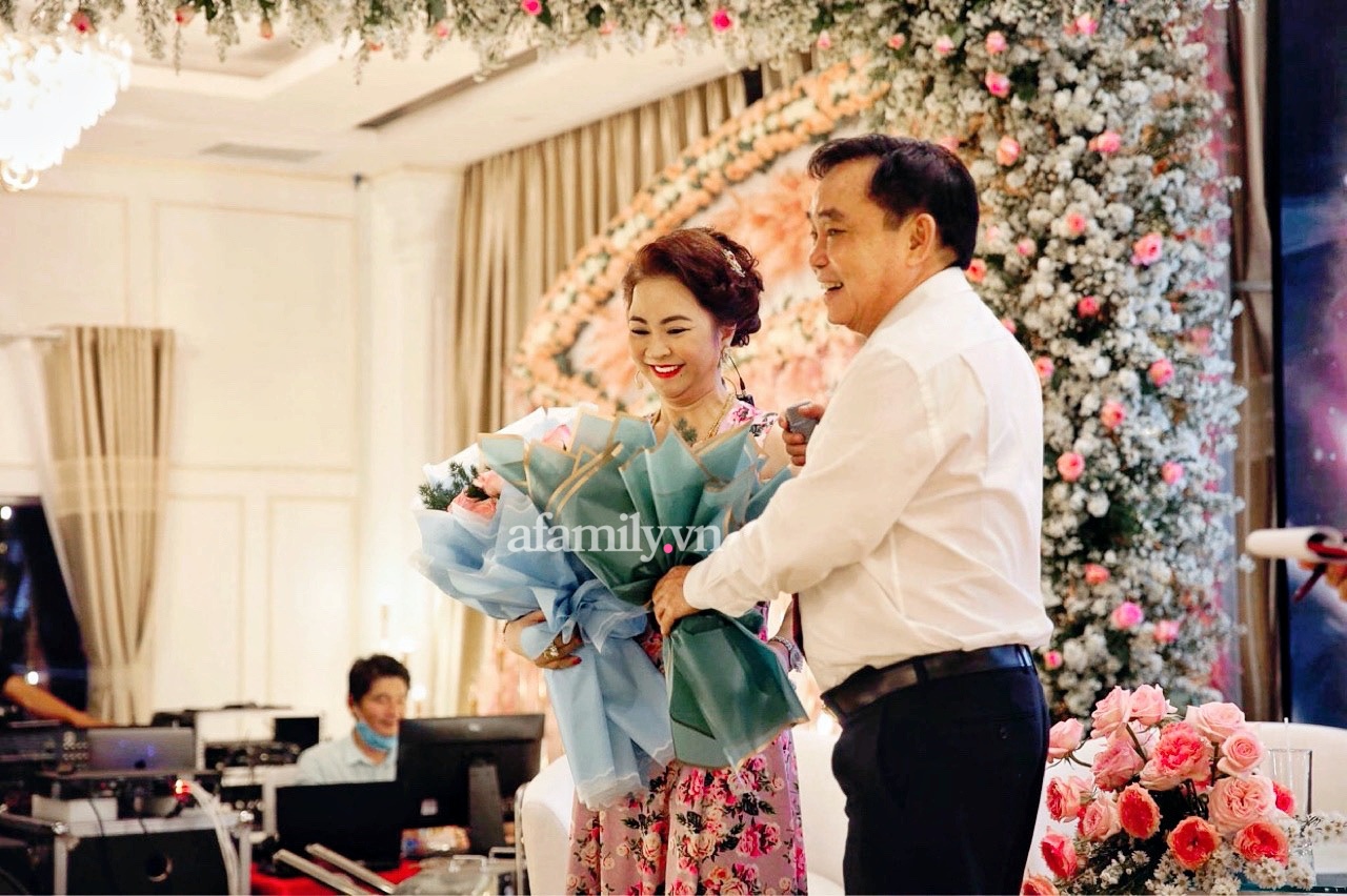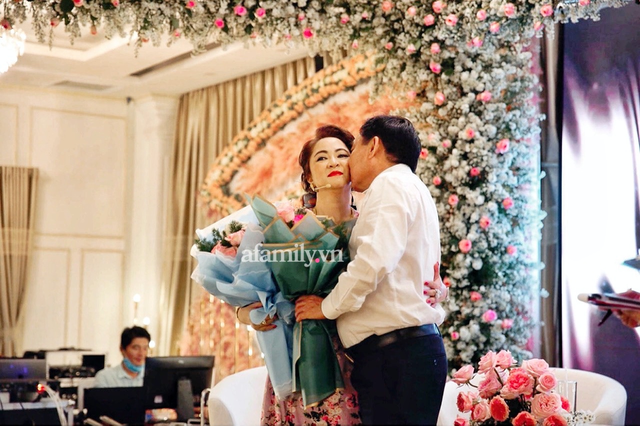 Trước sự chứng kiến của hàng nghìn người, ông Huỳnh Uy Dũng đã tận tay trao tặng vợ một bó hoa đồng thời lần đầu tiên ôm hôn vợ trước mặt đông đảo quan khách.