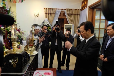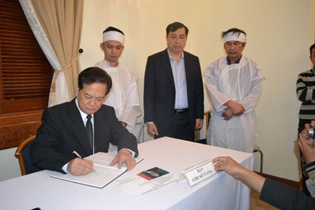 Thủ tướng Nguyễn Tấn Dũng thắp nhang và viết vào sổ tang chia buồn. |