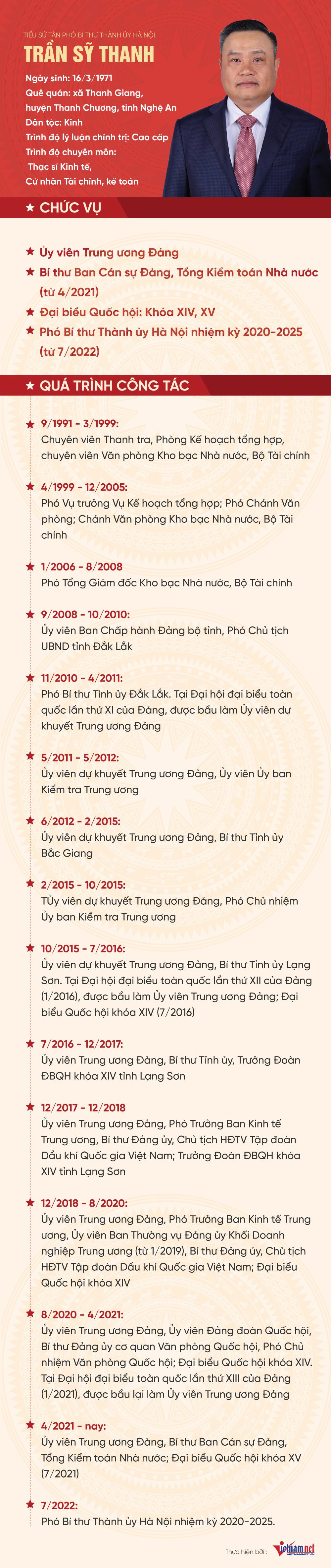 Tân Phó Bí thư Thành uỷ Hà Nội Trần Sỹ Thanh từng giữ chức vụ Chủ tịch tập đoàn PVN, ông cũng trải qua nhiều chức vụ quan trọng trong hệ thống chính trị trong đó có chức vụ Bí thư tỉnh Bắc Giang, rồi Lạng Sơn, Tổng Kiểm toán Nhà nước