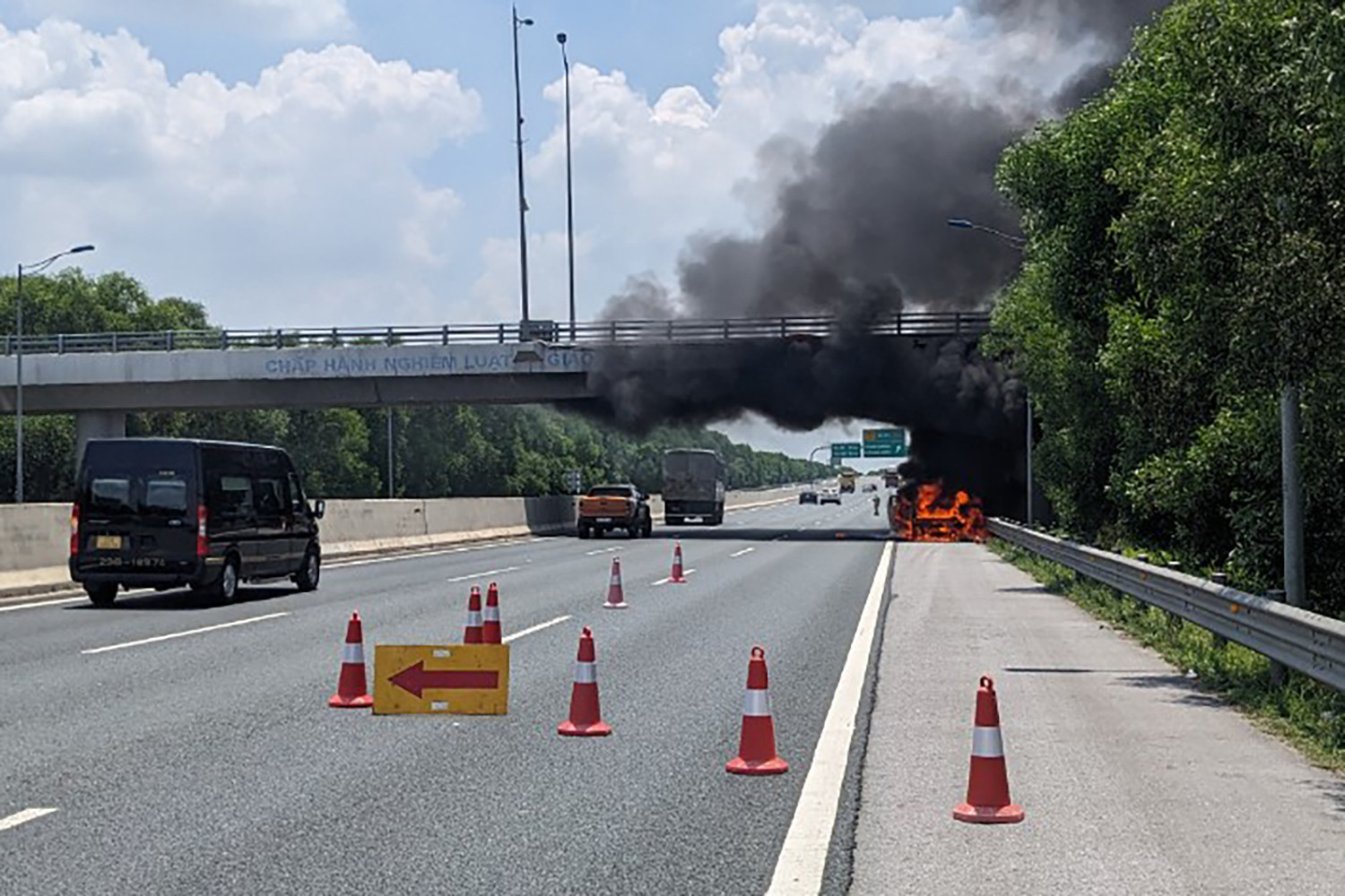 Tại hiện trường, ô tô bán tải đã được đỗ gọn vào làn dừng đường khẩn cấp trên cao tốc, các hành khách trên xe kịp thời thoát ra ngoài.