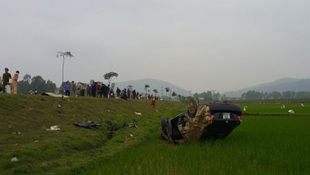 Ôtô 5 chỗ màu đen được xác định mất lái, lấn sang trái đường và húc tung xe máy xuống ruộng lúa khiến một người tử vong tại chỗ.