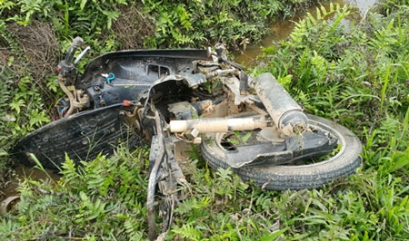 Xe máy của nạn nhân vỡ nát. Ảnh: Phương Linh. |