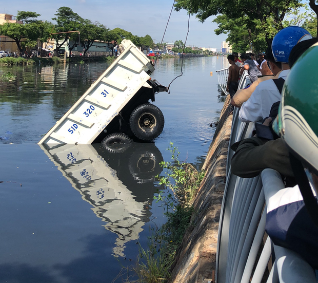 Hiện trường, một dải lan can để ngăn bờ kênh với mặt đường bị xe ben tông văng. Do xe ben có trọng tải khá lớn nên lực lượng chức năng mất nhiều thời gian để trục vớt.