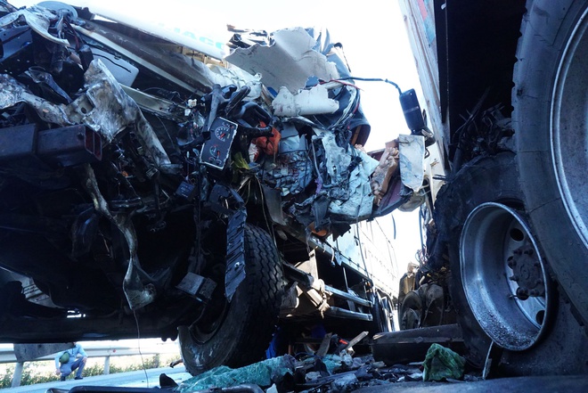 Cú tông mạnh khiến tài xế Toản cùng phụ xe Trịnh Huy Tùng (38 tuổi, trú tỉnh Hưng Yên) bị thương nặng, mắc kẹt trong cabin.