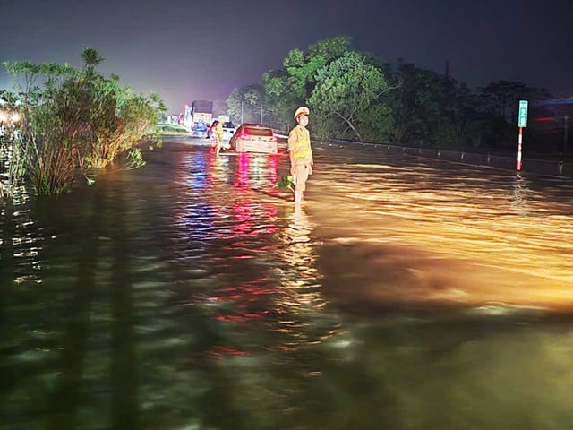 Đến sáng 10/10, cao tốc Hà Nội - Thái Nguyên (đoạn qua Hà Nội) vẫn ngập úng, lực lượng CSGT tiếp tục bố trí cán bộ, chiến sĩ phân luồng giao thông.