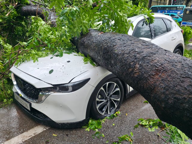 Cây cổ thụ bật gốc đè trúng 2 ô tô giữa trung tâm Hà Nội khiến người dân sợ hãi.