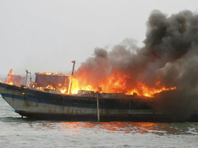 Vụ cháy xảy ra vào lúc 5g ngày 7-5, gây thiệt hại gần 3 tỉ đồng khi con tàu cấp đông chuyên mua hải sản của Công ty Trường Thạnh đang đậu tại bờ biển xã Long Hải, huyện đảo Phú Quý.
