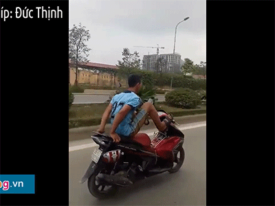 Nam thanh niên đầu không đội mũ bảo hiểm, điều khiển xe máy bằng chân phóng vun vút trên đường dành riêng cho xe buýt nhanh BRT.