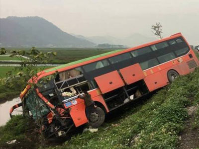 Tai nạn xảy ra lúc 15h ngày 15/2 trên đường tránh TP Vinh đoạn qua xã Hưng Đạo, huyện Hưng Nguyên (Nghệ An) khiến 2 người bị thương, nhiều hành khách hoảng loạn đập cửa kính thoát ra ngoài.