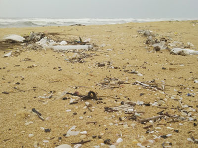 Nhiều mảng dầu vón cục có kích thước từ 0,5 đến 10cm trôi dạt vào bờ biển kèm theo nhiều chai lọ có chữ nước ngoài.