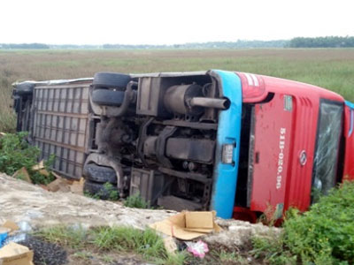 Xe khách khi đánh lái tránh một taxi tạt đầu đã tông vào dải phân cách, lật ngang làm 14 người nhập viện.