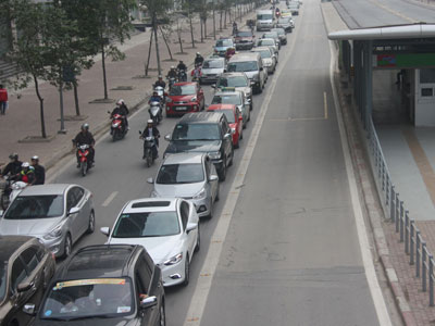 Ôtô xếp hàng dài nhường đường xe buýt nhanh