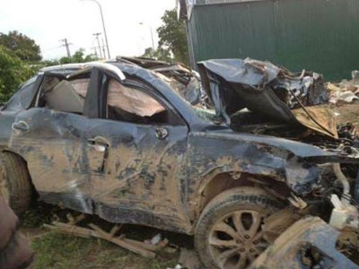 Xe 5 chỗ biến dạng sau cú lộn nhào trên vỉa hè
