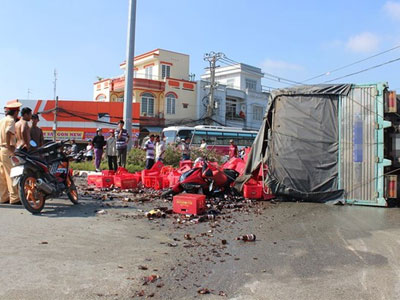 Vừa qua cầu ở Đồng Nai, ôtô tải chuyển hướng rẽ thì lật nghiêng làm hàng trăm két bia đổ xuống đường đúng lúc có người đi xe máy ngang qua.
