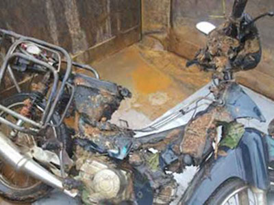 Xe máy bốc cháy trên đoạn đường đầy dầu nhớt